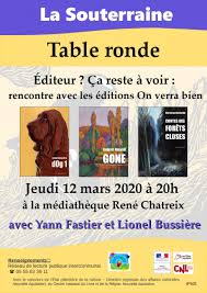Le réseau intercommunal du pays Sostranien propose une table ronde sur le thème « Éditeur ? Ça reste à voir : rencontre avec les éditions On verra bien ». Cette table ronde se déroulera le jeudi 12 mars 2020 à 20 h, à la médiathèque René Chatreix de La Souterraine, en présence de Yann Fastier et Lionel Bussière.