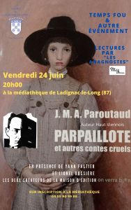Le vendredi 24 juin à 20h00 à la médiathèque de Ladignac le Long, des lectures de textes extraits de Parpaillote et autres contes cruels de J.M.A. Paroutaud seront proposées par l’association Méliscènes. Nous serons présents pour répondre à vos questions et proposer nos livres.